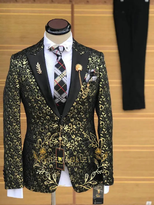 Gold Leopard Luxury Men Suits Slim Fit Peaked Lapel Groom Formal Tuxedos Prom 3 Pcs Sets Business Male Blazer Costume Homme