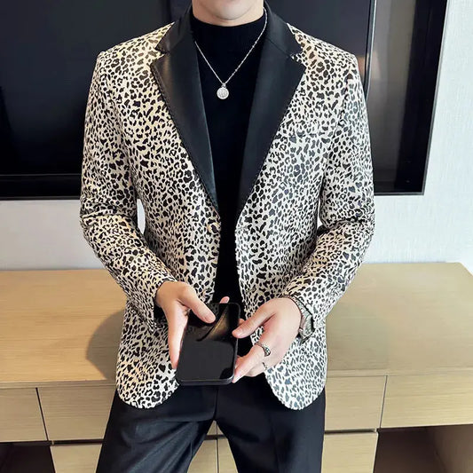 Splicing Leather Collar Men's Suit Jacket Blazer
