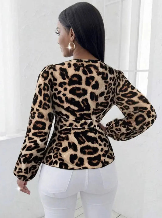 European and American leopard print spring and autumn fashionable and versatile lacing waist cinching slim long-sleeve shirt