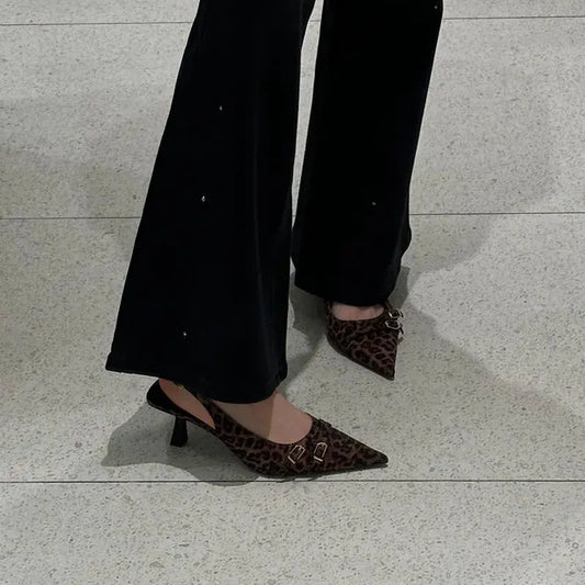 Leopard High Heels Ladies Pointed Toe Slingback Sandals Summer Plus Size Women Comfort Low Heel Office Pumps Elegant Dress Shoes