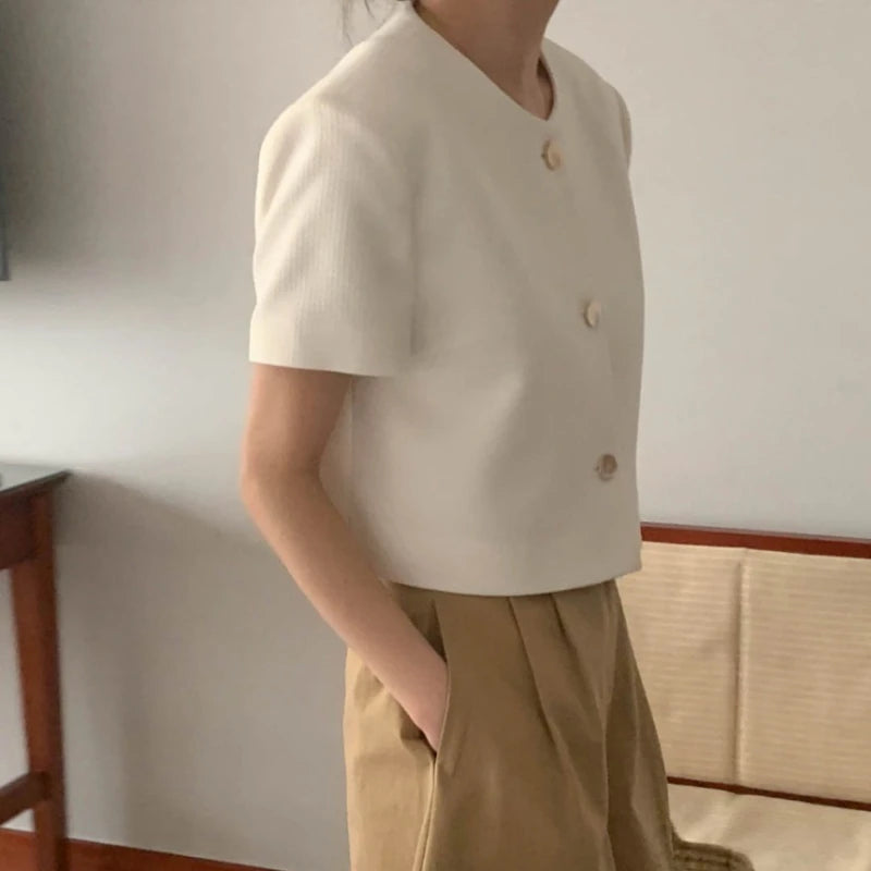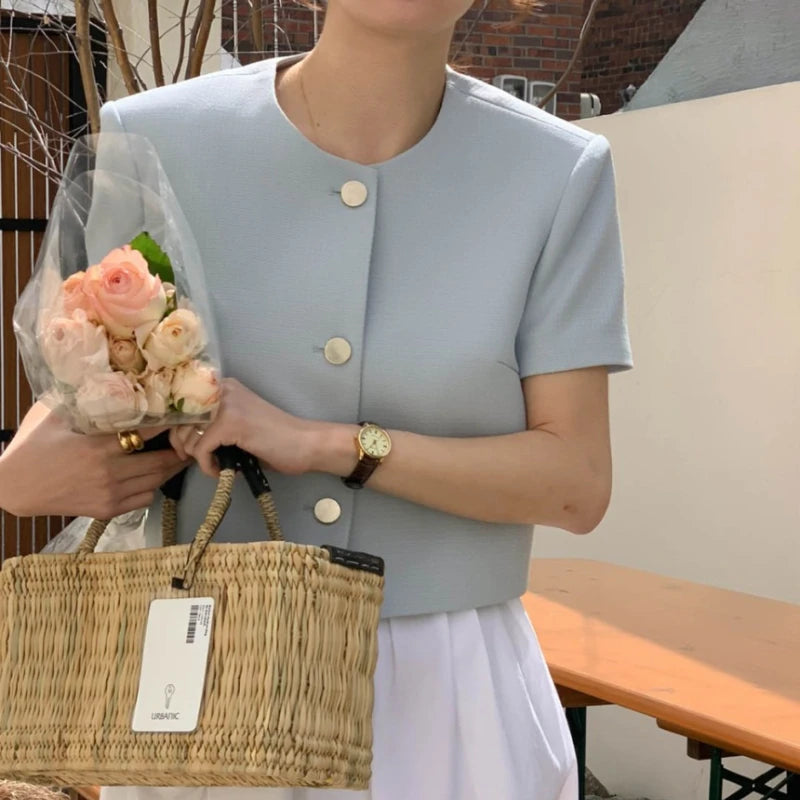 REALEFT Spring Summer Elegant Women's Jackets 2025 New Short Sleeve Korean O-neck Single Breasted Solid Short Outwear Female